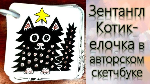 Зентангл Котик-елочка в авторском скетчбуке