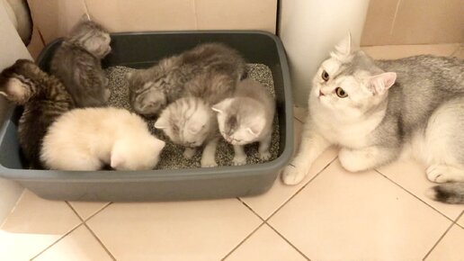 Котята кошки Кайли впервые осваивают кошачий лоток. Котятам 28 дней.