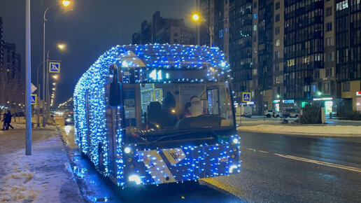 "С Новым Годом!" Троллейбус с УАХ "Мегаполис" ТролЗа-5265.08 в гирляндах №1002 по №41 в Санкт-Петербурге, дек.2023г.