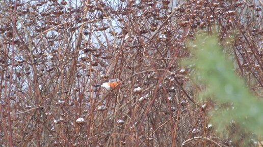 Мой знакомый снегирь со своим семейством жрёт куст