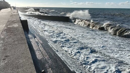 Адлер, 28.12.2023, очередной мощный шторм, но хотя бы солнечно. Правда заметно похолодало с 14-16 накануне до 8-10 градусов сегодня.