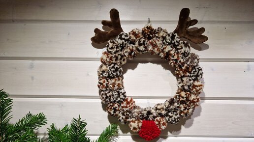 Рождественский (новогодний) венок "Олень" из помпонов. Венок из пряжи. Венок своими руками. DIY рождественский венок.