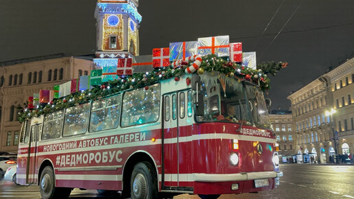 ДедМоробус ЛАЗ-695Н №Р989ВМ отправляется от Гостиного двора, дек.2023г.