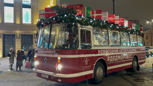 ДедМоробус ЛАЗ-695Н №Р989ВМ приезжает к ТЦ Галерея, дек.2023г.