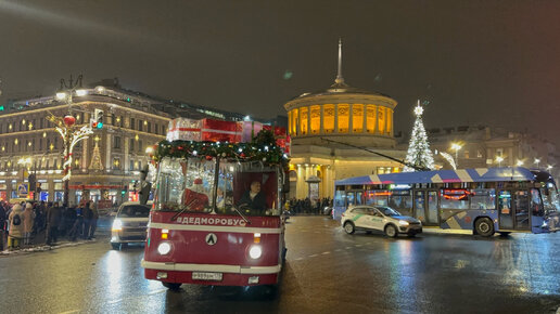 ДедМоробус ЛАЗ-695Н №Р989ВМ поворачивает с Невского на Лиговский проспекты, дек.2023г.