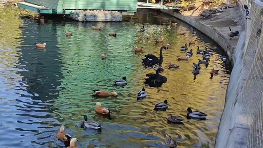 Красивые чёрные лебеди и забавные утки в Московском зоопарке выпрашивают корм у посетителей.