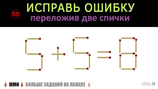 Головоломка со спичками 🥢 5+5=8 😎 Переложи две спички и получи верное равенство 🥢 Задачка для математиков