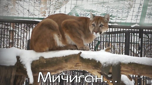 Маленькая пумочка Эри гуляет в зимнем вольере и самец Мичиган.