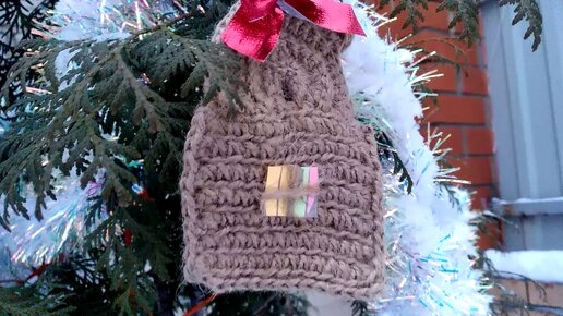 Новогодняя туя в стиле эко. Домик и ёлочка из джута украсили зелёную красавицу