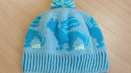 Шапочка для мальчика Драконы двойная двухсторонняя с жаккардовым узором, двухсторонний жаккард драконы, двухцветная резинка на пяти спицах
