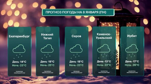 Погода 8 Января Понедельник в Екатеринбурге, Нижнем Тагиле, Серове, Каменске-Уральском, Ирбите
