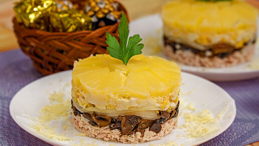 Праздничный слоеный салат с курицей, грибами и ананасами - классика новогоднего жанра