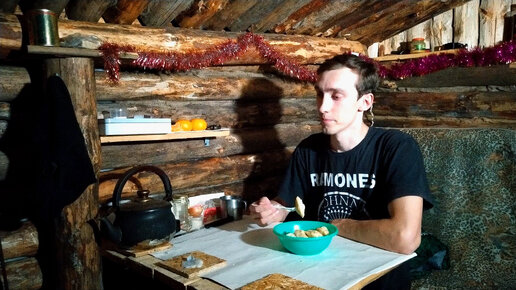 На лыжах в землянку у реки. Предновогодний день. Пельмени в землянке.