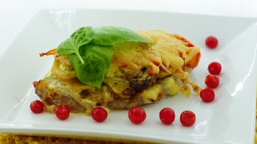 🥘 Мясо по-королевски, рецепт запекания свинины с грибами, картофелем, помидорами и сыром в духовке