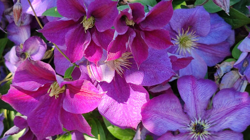Клематисы Блю Котильон, Руж Кардинал, Арабелла, Блю Лайт, Монинг Скай, Супер Нова, Этуаль Виолет и др. в моём саду
