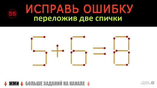 Головоломка со спичками 🥢 5+6=8 😎 Получи верное равенство переложив 2 спички 🥢