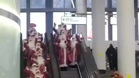 Много Дедов Морозов танцует в Московском метро