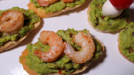 Брускетта с креветками и авокадо.