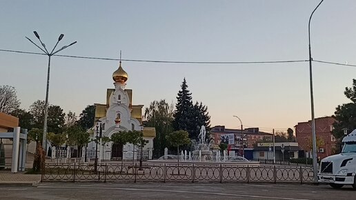 Храм Св. Андрея Первозванного, фонтан и фрагмент ул. Октябрьская в ст. Тбилисская Краснодарского края