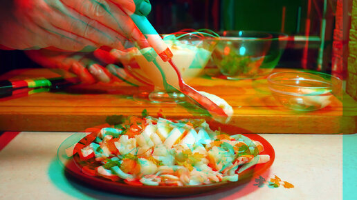 3D stereo red-cyan Салат из кальмаров с камбалой и орехово-сырным соусом