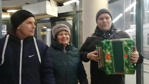 Поём "Катюшу" под русскую гармонь перед отправлением поезда. Провожаем участников фестиваля "Играй, гармонь блокадная" Январь, 2020 год