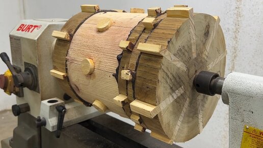 Объединил деревянные чопики и дощечки в круглые обрезки. И крутанул на станке.