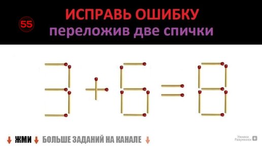 Головоломка из спичек 🥢 3+6=8 😎 Получи верное равенство переложив 2 спички 🥢