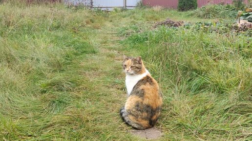 Бездомная трехцветная кошка наелась, выспалась днем и к вечеру вышла гулять на участок. Машка отправляется на прогулку по соседским дачам