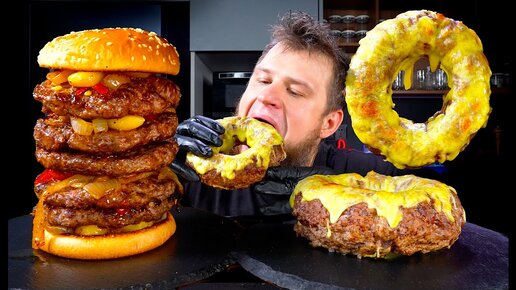 МЕГА БУРГЕР, ПОНЧИК ИЗ МЯСА С ОВОЩАМИ И СЫРОМ, ASMR MUKBANG, АСМР МУКБАНГ, 먹방, 大食い, たべる, 谢尔盖