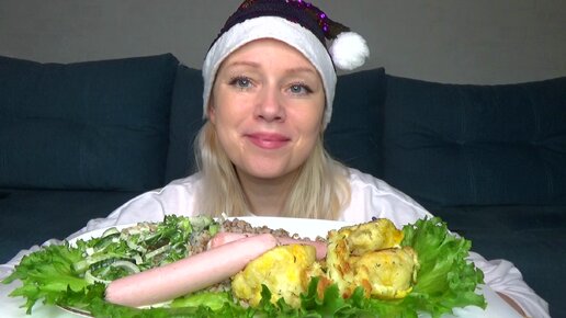 Мукбанг ПП, капуста цветная в кляре, гречка с сосисками и свежий салатик. Еда.