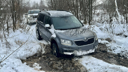 SKODA YETI, HUMMER H3, HAVAL H9 и MITSUBISHI PAJERO SPORT в зимнем лесу на разведке нового маршрута.