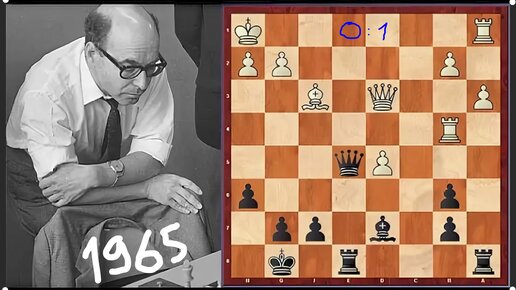 Давид Бронштейн эффектно создает матовые угрозы черной тяжелой артиллерией белому королю Владаса Микенаса. После 24...Л:а3! 0-1. Таллин 1965