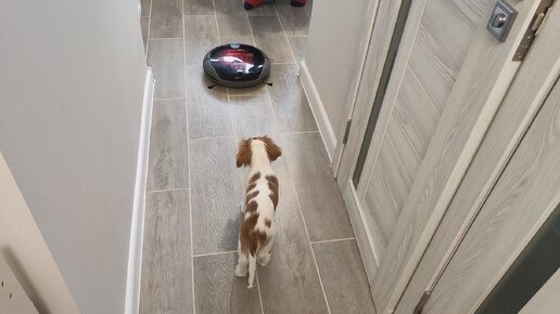 Собака Кавалер Кинг Чарльз спаниель и робот-пылесос