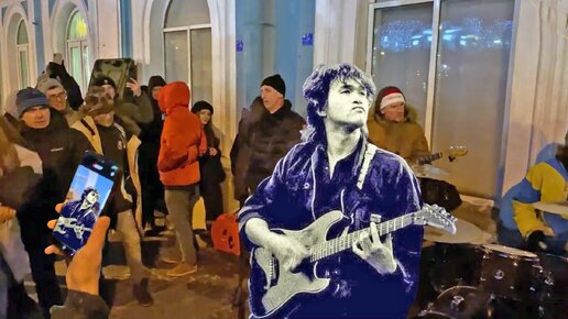 Петербуржцы в новогоднюю ночь на Невском проспекте танцуют под песню Цоя "Мы ждем перемен" в исполнении уличных музыкантов