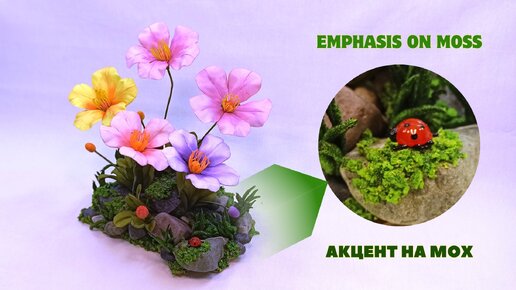 Интерьерная композиция: "Островок с цветами из лент". Мох своими руками.