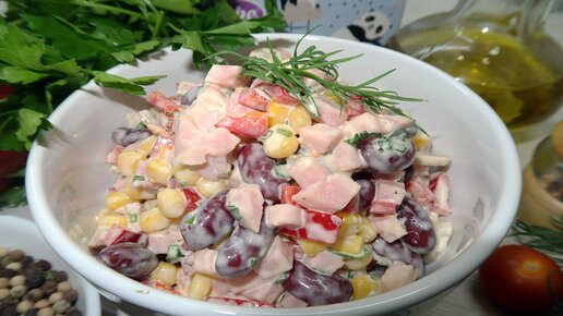 Простой, но очень вкусный салат с маринованными шампиньонами, ветчиной и перцем