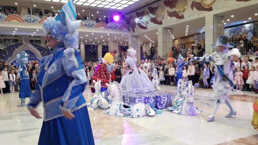 Фрагмент-1 развлекательного детского шоу перед представлением в холле Государственного Кремлевского Дворца. Москва, Кремль. 30.12.2023