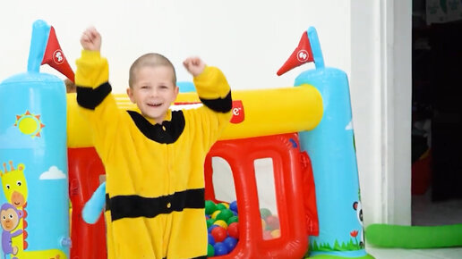 Ребенок построил дом и пришел в гости попрыгать на надувном батуте с цветными шариками