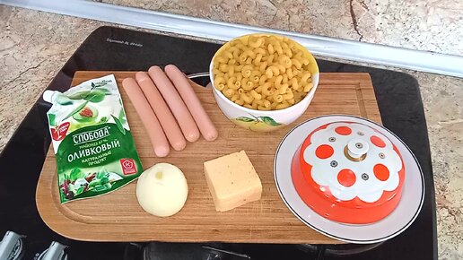 Макароны обжаренные на сковороде и тушенные с сосисками, луком и сыром в майонезном соусе со специями.