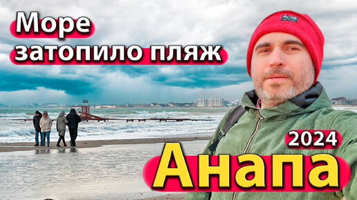 Анапа - море затопило пляж. Шторм смывает всё. Центр курорта. Сезон 2024 - зима.