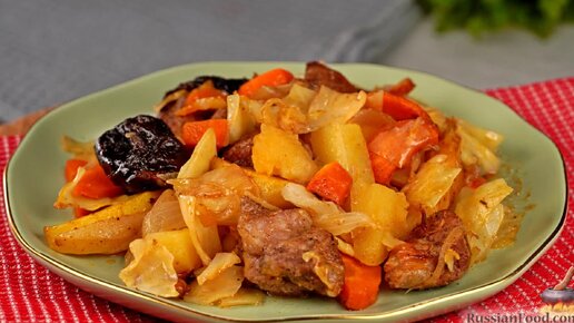 Чернослив добавит аромат дымка. Мясо с овощами в рукаве