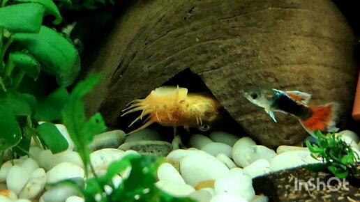 Леопардовый анциструс отдыхает лёжа на спине в аквариуме с самцами гуппи