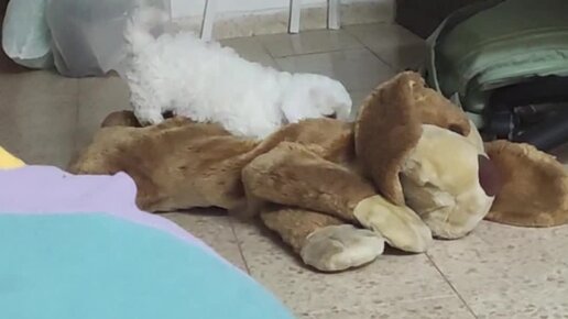 Бакс играет с плюшевой собачкой и грызет мои пальцы