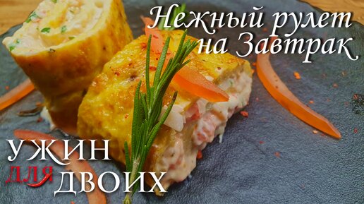 Нежный рулет из омлета на завтрак. Сочетание крабовых палочек, помидора и двух видов сыра, поможет вам проснуться