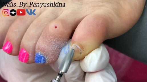 Обработка болезненной мозоли на пальце| эстетическая обработка мизинца с налипшей кутикулой| аппаратный педикюр на влажной коже