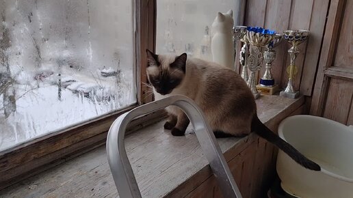 Котята знакомятся со снегом, который намело на балкон во время метели