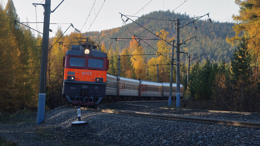 Проходящие поезда в Сибири на перегоне Турма - Вихоревка Восточно-Сибирской железной дороги золотой осенью. Сентябрь 2023 года