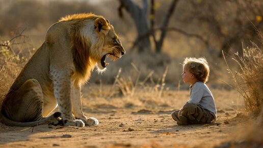Огромный Лев появился прямо перед маленьким одиноким Peбёнкoм