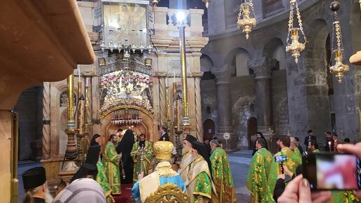 Патриарх служит на Богоявление на Гробе Господнем. Праздничный Крестный ход идёт вокруг Кувуклии