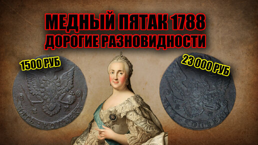 Самая дорогая и редкая медная монета 5 копеек 1788 года, вензель Екатерины II, разновидности монет России